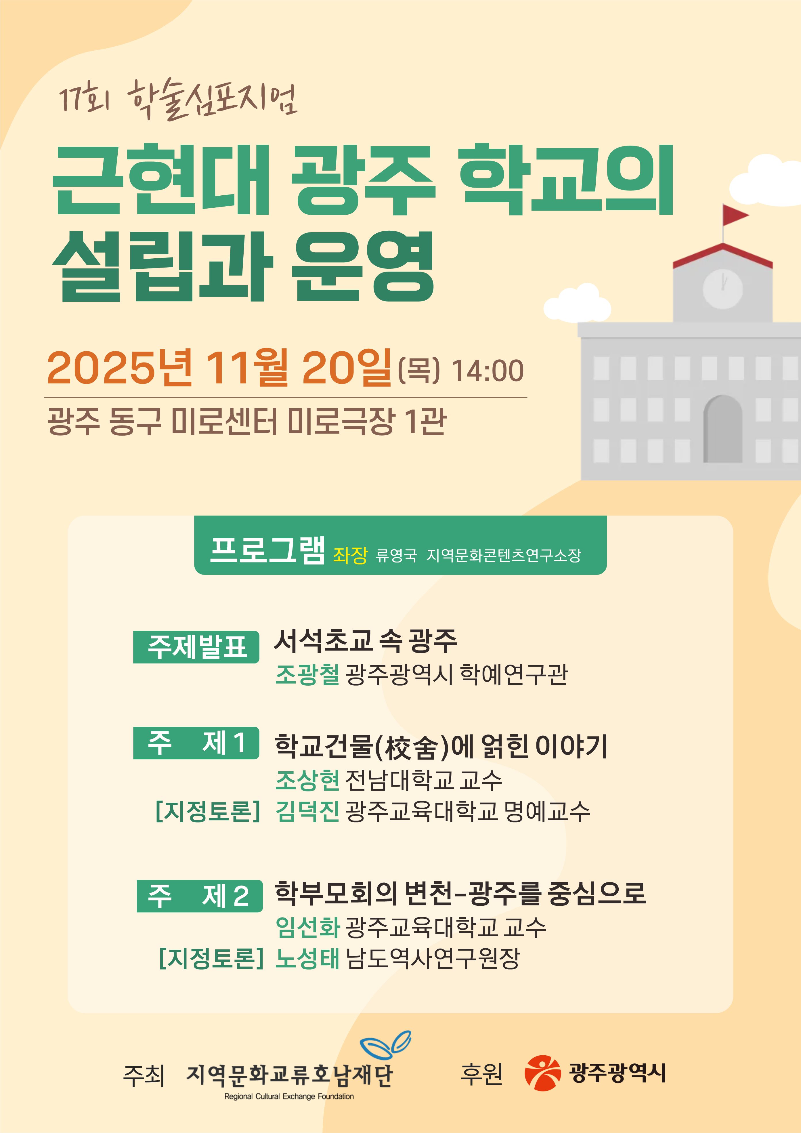 1896년부터 시작된 광주의 근대교육과 광주 초·중등교육기관의 변천 과정과 학교 건물의 시기적 운용, 학생과 학부모의 생활상을 조명하기 위해 마련된 특별한 자리입니다. 전문가와 시민이 함께하는 심포지엄, 많은 관심과 참여 부탁드립니다!